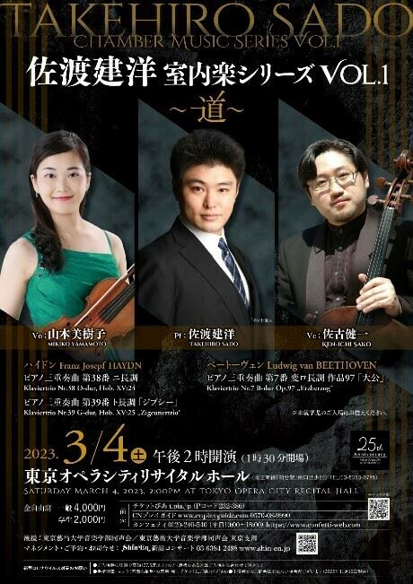 佐渡建洋 室内楽シリーズVOL.1 23/3/4(土) 東京オペラシティ リサイタルホール シェア ツイート 公演情報 ジャンル 器楽 室内楽 未就学児童は入場できません。学生券は当日要学生証。ご入場時の検温で高熱(37.5度以上)の方・症状のある方、感染者が身近にいる場合はご入場を見合わせて頂きます。会場内ではマスク(不織布推奨)を鼻まで正しくご着用下さい。 料金 全自由一般-4,000円 全自由学生-2,000円 表示できるチケット情報はありません詳しくはこちら キャスト&スタッフ 演奏 佐渡建洋 山本美樹子 佐古健一 お問い合わせ 新演コンサート シェア ツイート