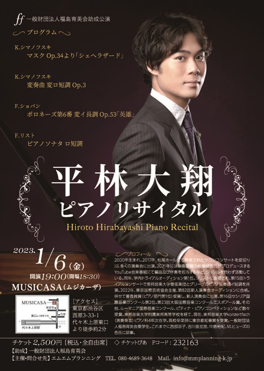 平林大翔ピアノリサイタル 23/1/6(金) ムジカーザ シェア ツイート 公演情報 ジャンル ピアノ・鍵盤楽器 未就学児童は入場不可 料金 全席自由-2,500円 表示できるチケット情報はありません詳しくはこちら キャスト&スタッフ ピアノ 平林大翔 お問い合わせ エムエムプランニング シェア ツイート