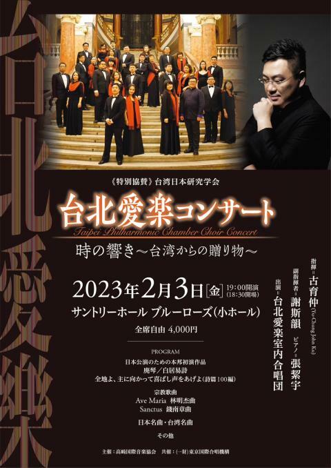 台北愛樂コンサート 時の響~台湾からの贈り物~ 23/2/3(金) サントリーホール ブルーローズ(小ホール) シェア ツイート 台湾が誇る台北愛樂室内合唱団の日本初公演! 公演情報 ジャンル 声楽 未就学児の入場はご遠慮ください。小学生以上はチケットが必要になります。一度購入されたチケットの払い戻し、交換はいたしかねますので、ご了承ください。 料金 全席自由-4,000円 表示できるチケット情報はありません詳しくはこちら キャスト&スタッフ 出演 台北愛楽合唱団 お問い合わせ 高崎国際音楽協会 シェア ツイート