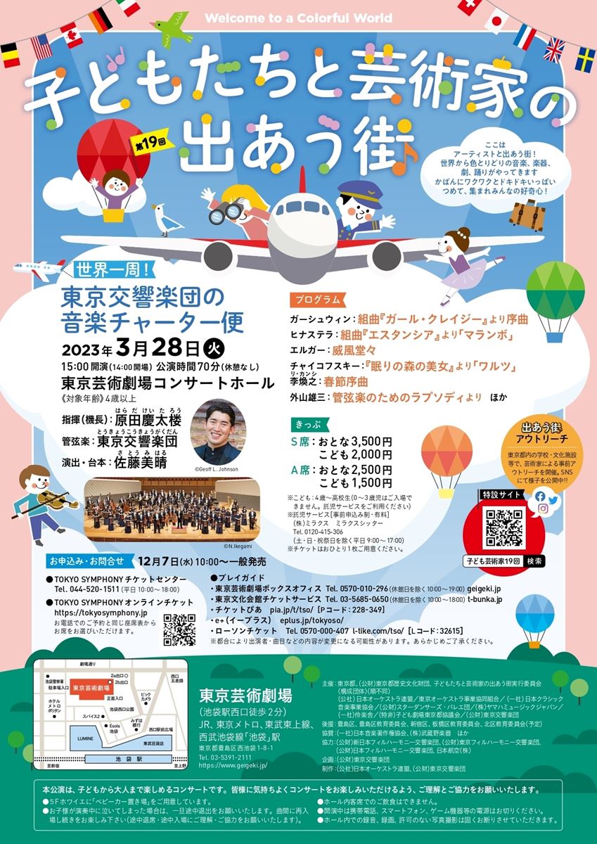 子どもたちと芸術家の出あう街~東京交響楽団の音楽チャーター便~ 23/3/28(火) 東京芸術劇場 コンサートホール シェア ツイート ここはアーテイストと出あう街!世界から色とりどりの音楽、楽器、劇、踊りがやってきます。かばんにワクワクとドキドキいっぱいつめて、集まれみんなの好奇心! 公演情報 ジャンル オーケストラ 3歳以下は入場不可。【払戻に関して】https://tokyosymphony.jp/pc/news/news_4391.html 料金 S席大人-3,500円 S席子ども(4歳~高校生)-2,000円 A席大人-2,500円 A席子ども(4歳~高校生)-1,500円 表示できるチケット情報はありません詳しくはこちら キャスト&スタッフ 指揮 原田慶太楼 管弦楽 東京交響楽団 演出 佐藤美晴 お問い合わせ TOKYO SYMPHONYチケットセンター 公式サイト シェア ツイート