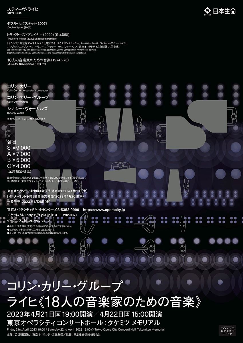 コリン・カリー・グループ 23/4/21(金)~23/4/22(土) 東京オペラシティ コンサートホール:タケミツメモリアル シェア ツイート ライヒ《18人の音楽家のための音楽》 公演情報 ジャンル 器楽 室内楽 未就学児童は入場不可。 料金 S席-9,000円 A席-7,000円 B席-5,000円 C席-4,000円 表示できるチケット情報はありません詳しくはこちら キャスト&スタッフ 出演 コリン・カリー・グループ 共演 シナジー・ヴォーカルズ お問い合わせ 東京オペラシティチケットセンター 公式サイト シェア ツイート