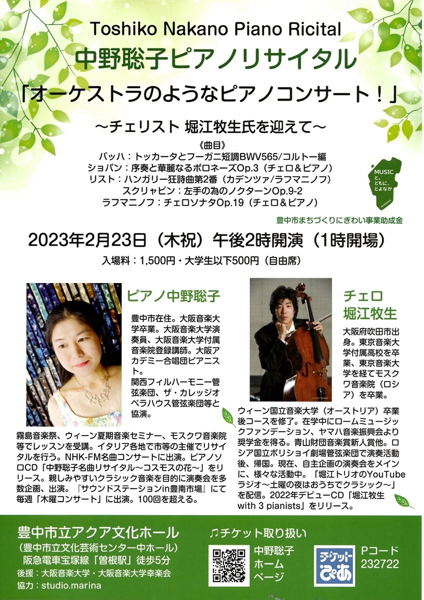 中野聡子ピアノリサイタル 23/2/23(木) 豊中市立アクア文化ホール(豊中市立文化芸術センター中ホール) シェア ツイート 「オーケストラのようなピアノコンサート~チェリスト堀江牧生氏を迎えて~ 公演情報 ジャンル ピアノ・鍵盤楽器 料金 全席自由 一般-1,500円 全席自由 大学生以下-500円 表示できるチケット情報はありません詳しくはこちら キャスト&スタッフ 出演 中野聡子 堀江牧生 お問い合わせ 中野聡子ホームページ シェア ツイート