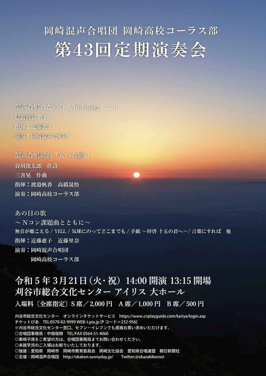 岡崎混声合唱団 岡崎高校コーラス部 第43回定期演奏会 23/3/21(火) 刈谷市総合文化センター 大ホール シェア ツイート 公演情報 ジャンル 声楽 車椅子券あり。但し、ぴあでの取扱いなし。詳細は問合せ先まで。未就学児童は入場不可。 料金 S-2,000円 A-1,000円 B-500円 表示できるチケット情報はありません詳しくはこちら キャスト&スタッフ 出演 岡崎混声合唱団 岡崎高校コーラス部 指揮 近藤惠子 お問い合わせ 合唱団事務局:中根俊樹 シェア ツイート