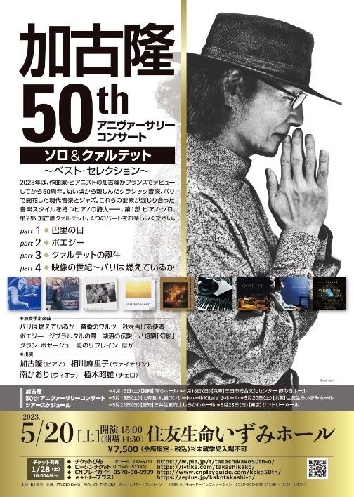加古隆 50thアニヴァーサリーコンサート ソロ&クァルテット~ベスト・セレクション~ 23/5/20(土) 住友生命いずみホール シェア ツイート 公演情報 ジャンル ピアノ・鍵盤楽器 室内楽 未就学児童は入場不可。 料金 全席指定-7,500円 表示できるチケット情報はありません詳しくはこちら キャスト&スタッフ 出演 加古隆 共演 相川麻里子 南かおり 植木昭雄 お問い合わせ キョードーインフォメーション シェア ツイート