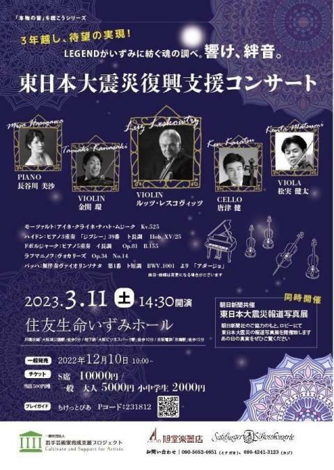 東日本大震災復興支援コンサート 23/3/11(土) 住友生命いずみホール シェア ツイート 3年越し、待望の実現!LEGENDがいすみに紡ぐ魂の調べ。響け絆音。 公演情報 ジャンル 器楽 室内楽 公演前には、東日本大震災報道写真展がロビーにて開催されます。(入場無料) 料金 S席-10,000円 A席-5,000円 A席学生-2,000円 表示できるチケット情報はありません詳しくはこちら キャスト&スタッフ 出演 ルッツ・レスコヴィッツ 松実健太 唐津健 金関環 長谷川美沙 お問い合わせ 一般社団法人 若手芸術家支援プロジェクト シェア ツイート