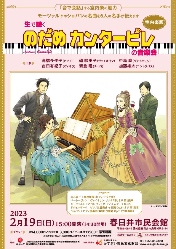 生で聴く"のだめカンタービレ"の音楽会《室内楽版》 23/2/19(日) 春日井市民会館 シェア ツイート 「音で会話」する室内楽の魅力。巨大スクリーンに漫画のシーンと解説を投影。生演奏と共に楽しめる! 公演情報 ジャンル 器楽 室内楽 ※未就学児入場不可。小学生は要保護者同伴。 料金 一般-4,000円 小中高生-500円 小中高生-入場時証明書提示要 表示できるチケット情報はありません詳しくはこちら キャスト&スタッフ 出演 高橋多佳子 礒絵里子 中島麻 吉田有紀子 新倉瞳 加藤雄太 お問い合わせ 公益財団法人かすがい市民文化財団 公式サイト シェア ツイート
