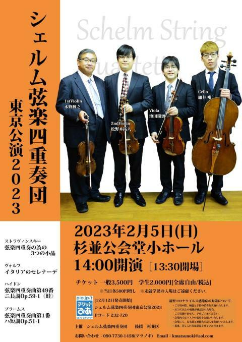 シェルム弦楽四重奏団 東京公演 2023 23/2/5(日) 杉並公会堂 小ホール シェア ツイート 弦楽四重奏の限りない魅力を、今年も多彩なプログラムで、みなさまへお届けします。 公演情報 ジャンル 器楽 室内楽 * 行政及び当団の新型コロナウィルス感染症対策に則った開催となります。* 未就学児の入場不可。 料金 全席自由 一般-3,500円 全席自由 学生-2,000円 表示できるチケット情報はありません詳しくはこちら キャスト&スタッフ 出演 木野雅之 松野木拓人 池田開渡 細井唯 お問い合わせ シェルム弦楽四重奏団 (マツノキ) シェア ツイート