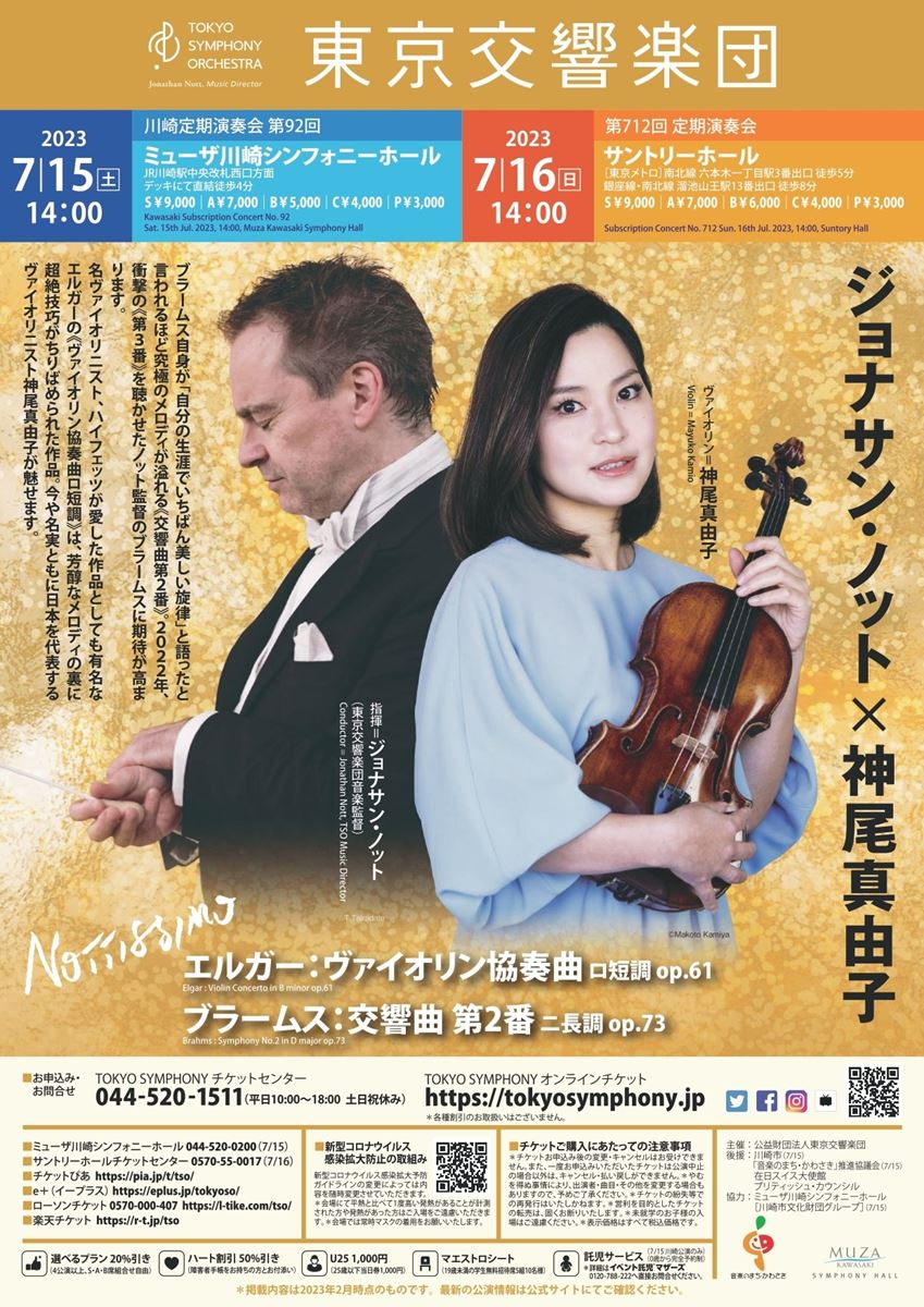 東京交響楽団 第712回 定期演奏会 23/7/16(日) サントリーホール 大ホール シェア ツイート エルガー:ヴァイオリン協奏曲 ロ短調 op.61/ブラームス:交響曲 第2番 ニ長調 op.73 公演情報 ジャンル オーケストラ 未就学児童は入場不可。出演者、曲目は予定のため変更の可能性あり。原則、公演中止を除き、出演者・曲目・その他変更等ある場合も払戻は承っておりません。 料金 S席-9,000円 A席-7,000円 B席-6,000円 C席-4,000円 P席-3,000円 表示できるチケット情報はありません詳しくはこちら キャスト&スタッフ 指揮 ジョナサン・ノット 管弦楽 東京交響楽団 ヴァイオリン 神尾真由子 お問い合わせ TOKYO SYMPHONYチケットセンター 公式サイト シェア ツイート