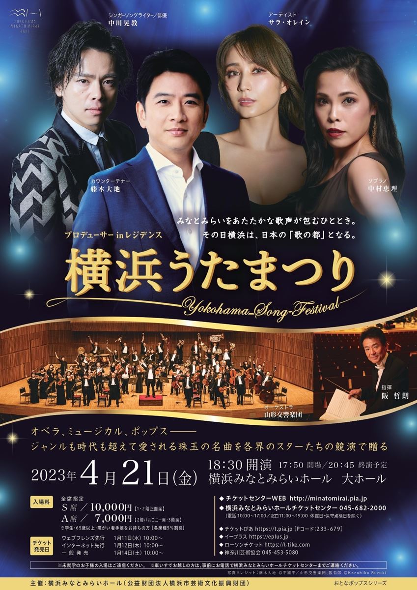 横浜うたまつり 23/4/21(金) 横浜みなとみらいホール 大ホール シェア ツイート みなとみらいをあたたかな歌声が包むひととき。その日横浜は、日本の「歌の都」となる。 公演情報 ジャンル 声楽 未就学児童は入場不可。 料金 S席-10,000円 S席 学生-9,500円 S席 シニア(65歳以上)-9,500円 A席-7,000円 A席 学生-6,650円 A席 シニア(65歳以上)-6,650円 表示できるチケット情報はありません詳しくはこちら キャスト&スタッフ 出演 藤木大地 中川晃教 中村恵理 サラ・オレイン 阪哲朗 山形交響楽団 お問い合わせ 横浜みなとみらいホールチケットセンター 公式サイト シェア ツイート