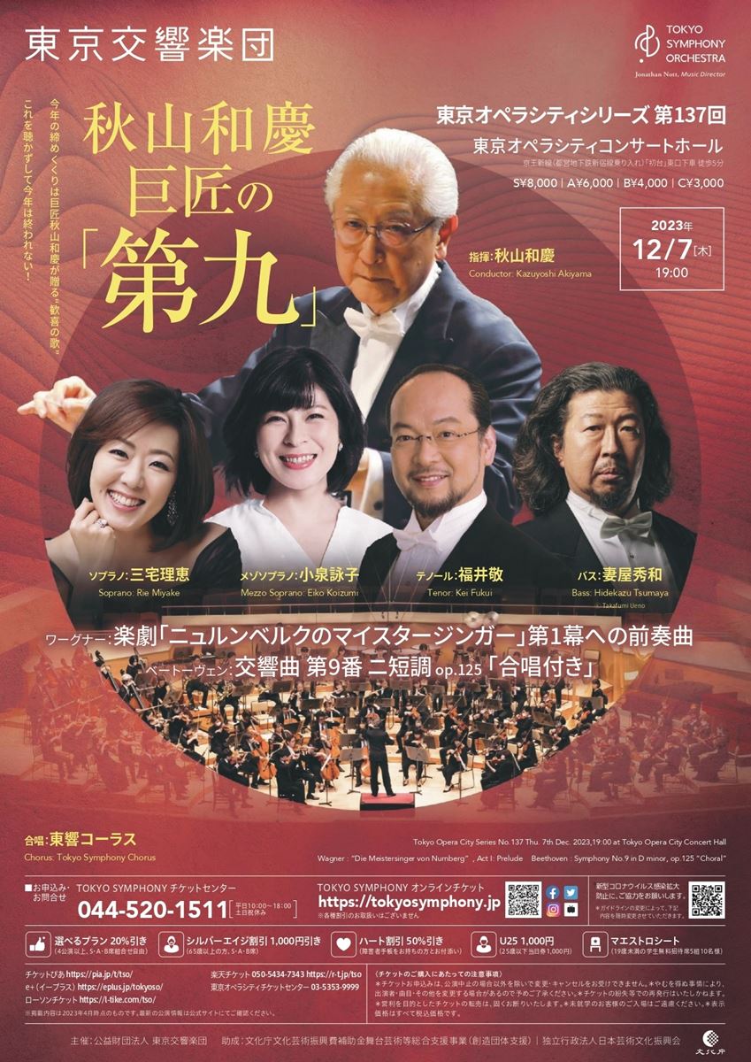 東京交響楽団 東京オペラシティシリーズ 第137回 23/12/7(木) 東京オペラシティ コンサートホール:タケミツメモリアル シェア ツイート ワーグナー:楽劇「ニュルンベルクのマイスタージンガー」第1幕への前奏曲/ベートーヴェン:交響曲 第9番 ニ短調 op.125 「合唱付き」 公演情報 ジャンル オーケストラ 未就学児童は入場不可。出演者、曲目は予定のため変更の可能性あり。原則、公演中止を除き、出演者・曲目・その他変更等ある場合も払戻は承っておりません。 料金 S席-8,000円 A席-6,000円 B席-4,000円 C席-3,000円 表示できるチケット情報はありません詳しくはこちら キャスト&スタッフ 指揮 秋山和慶 管弦楽 東京交響楽団 ソプラノ 三宅理恵 メゾソプラノ 小泉詠子 テノール 福井敬 バス 妻屋秀和 合唱 東響コーラス お問い合わせ TOKYO SYMPHONYチケットセンター 公式サイト シェア ツイート