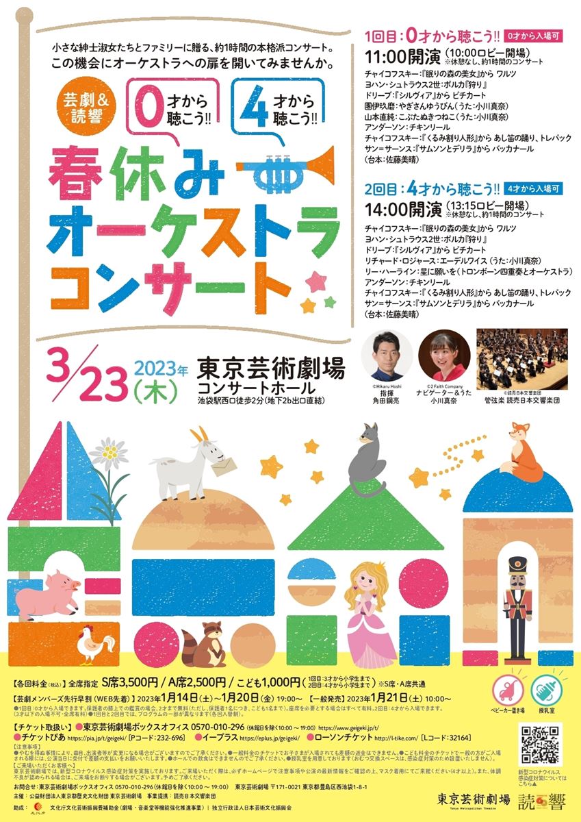 芸劇&読響 0才から聴こう!!/4才から聴こう!!春休みオーケストラコンサート 23/3/23(木) 東京芸術劇場 コンサートホール シェア ツイート 小さな紳士淑女たちとファミリーに贈る、ちょっと短めのオーケストラコンサート。 公演情報 ジャンル オーケストラ 出演者は予定のため変更の可能性あり。当劇場ウェブサイト内注意事項をご確認の上、マスク着用にてご来場ください。公演中止以外のいかなる場合でも、チケットのキャンセルはいたしかねます。この公演の最前列はB列です。 料金 S席 一般-3,500円 S席 こども-1,000円 A席 一般-2,500円 A席 こども-1,000円 S席 こども-3歳~小学生 S席 こども-4歳~小学生 A席 こども-3歳~小学生 A席 こども-4歳~小学生 表示できるチケット情報はありません詳しくはこちら キャスト&スタッフ 指揮 角田鋼亮 ナビゲーター、うた 小川真奈 管弦楽 読売日本交響楽団 お問い合わせ 東京芸術劇場ボックスオフィス 公式サイト シェア ツイート