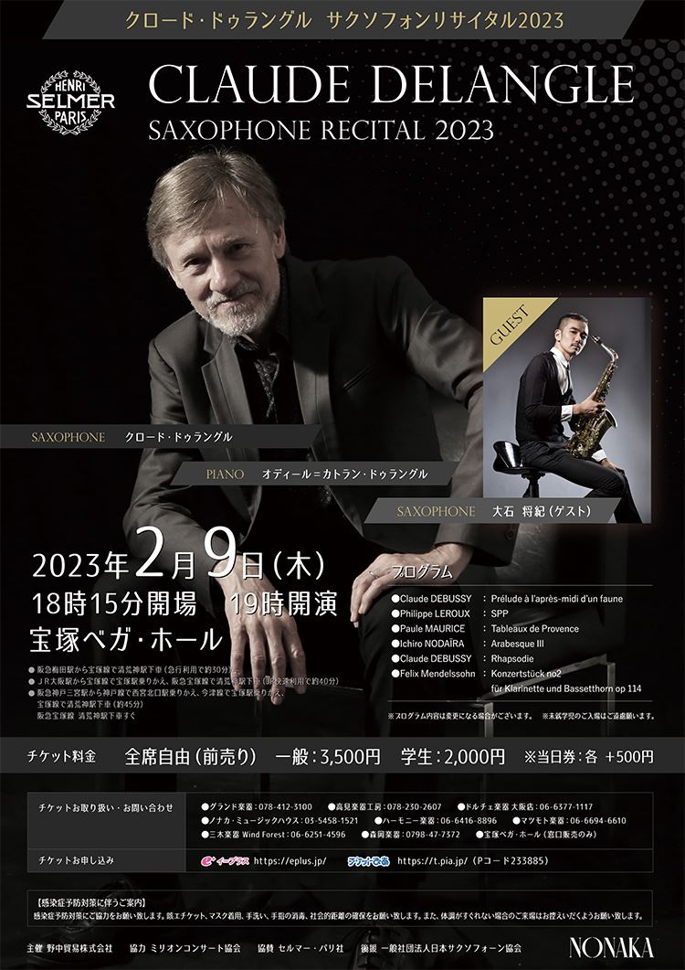 クロード・ドゥラングル サクソフォンリサイタル2023 23/2/9(木) 宝塚ベガ・ホール シェア ツイート 公演情報 ジャンル 器楽 室内楽 ※未就学児のご入場はご遠慮願います。 料金 自由席 一般-3,500円 自由席 学生-2,000円 表示できるチケット情報はありません詳しくはこちら キャスト&スタッフ 出演 クロード・ドラングル オディール・ドラングル 大石将紀 お問い合わせ (株)ノナカ・ミュージックハウス 公式サイト シェア ツイート