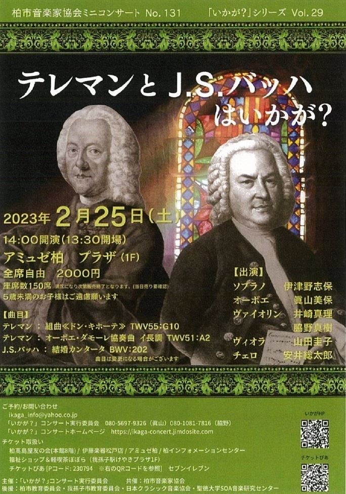 テレマンとJ.S.バッハはいかが? 23/2/25(土) アミュゼ柏 プラザ シェア ツイート バロック時代のスターだったテレマンと「音楽の父」J.S.バッハで、清々しい新年のスタートを! 公演情報 ジャンル 器楽 室内楽 5歳未満のお子様のご入場はご遠慮ください。 料金 全席自由-2,000円 表示できるチケット情報はありません詳しくはこちら キャスト&スタッフ 出演 伊津野志保 眞山美保 井崎真理 脇野真樹 山田圭子 安井総太郎 お問い合わせ 「いかが?」コンサート実行委員会 シェア ツイート