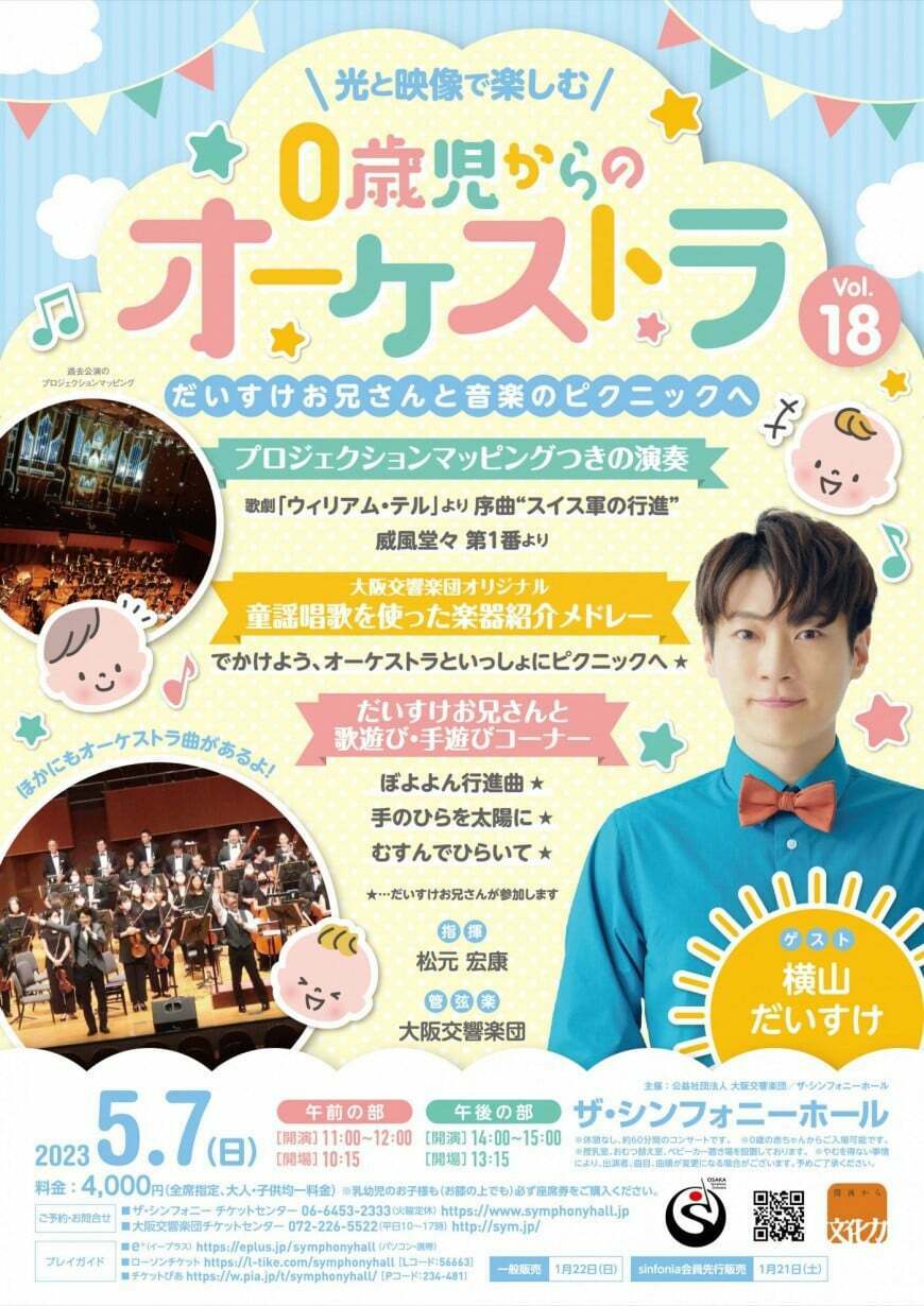0歳児からの"光と映像で楽しむオーケストラ"Vol.18 23/5/7(日) ザ・シンフォニーホール シェア ツイート だいすけお兄さんと音楽のピクニックへ 公演情報 ジャンル オーケストラ 乳幼児のお子様(膝上でも)も必ず座席券が必要です。 料金 全席指定-4,000円 全席指定-大人、子供同一料金 表示できるチケット情報はありません詳しくはこちら キャスト&スタッフ 指揮 松元宏康 ゲスト 横山だいすけ 演奏 大阪交響楽団 お問い合わせ 大阪交響楽団 公式サイト シェア ツイート