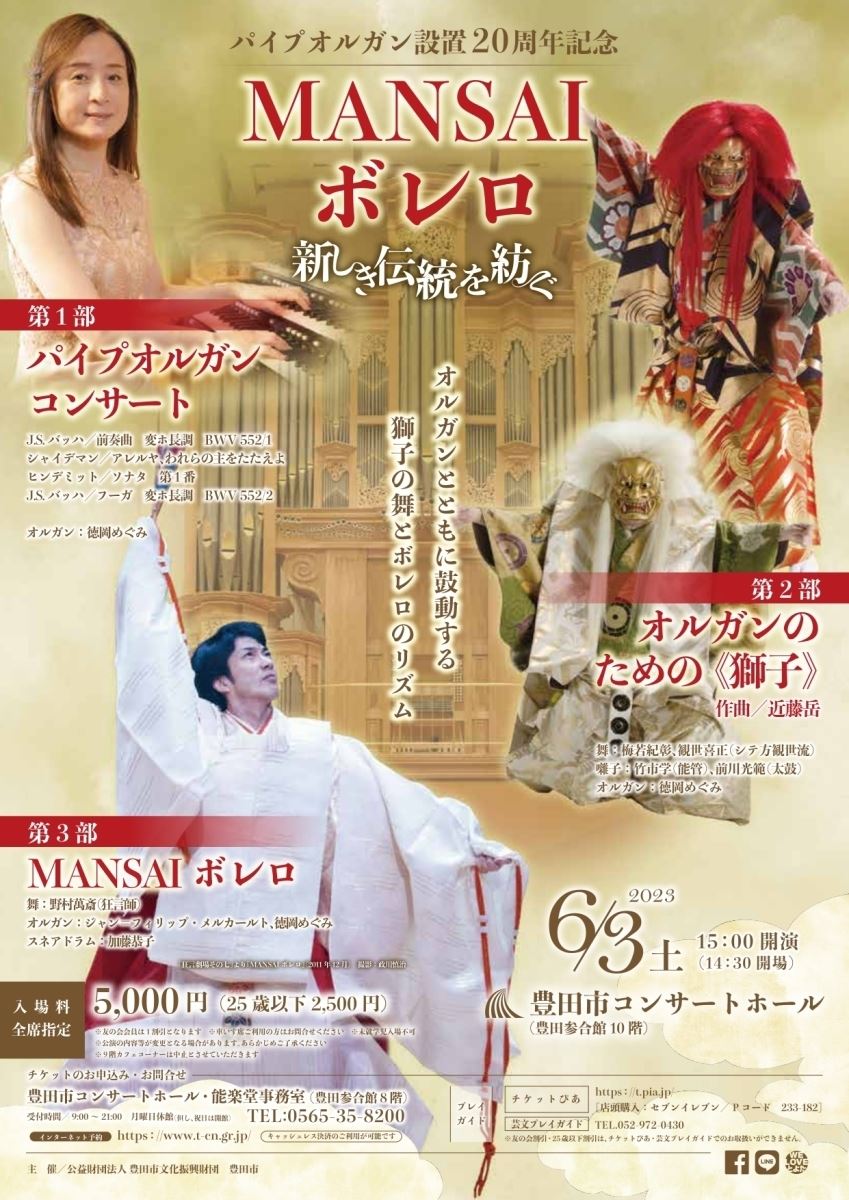パイプオルガン設置20周年記念MANSAIボレロ ~新しき伝統を紡ぐ~ 23/6/3(土) 豊田市コンサートホール シェア ツイート オルガンとともに鼓動する、獅子の舞とボレロのリズム 公演情報 ジャンル ピアノ・鍵盤楽器 未就学児同伴のご入場はご遠慮ください。 料金 一般-5,000円 表示できるチケット情報はありません詳しくはこちら キャスト&スタッフ 出演 野村萬斎 オルガン:ジャン=フィリップ・メルカールト、徳岡めぐみ お問い合わせ 豊田市コンサートホール 公式サイト シェア ツイート