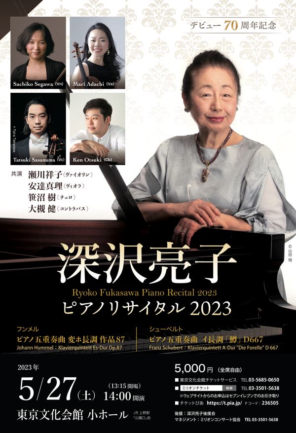 デビュー70周年記念 深沢亮子ピアノリサイタル2023 23/5/27(土) 東京文化会館 小ホール シェア ツイート 公演情報 ジャンル ピアノ・鍵盤楽器 室内楽 料金 全席自由-5,000円 表示できるチケット情報はありません詳しくはこちら キャスト&スタッフ 出演 深沢亮子 瀬川祥子 安達真理 笹沼樹 大槻健 お問い合わせ (株)ミリオンコンサート協会 シェア ツイート