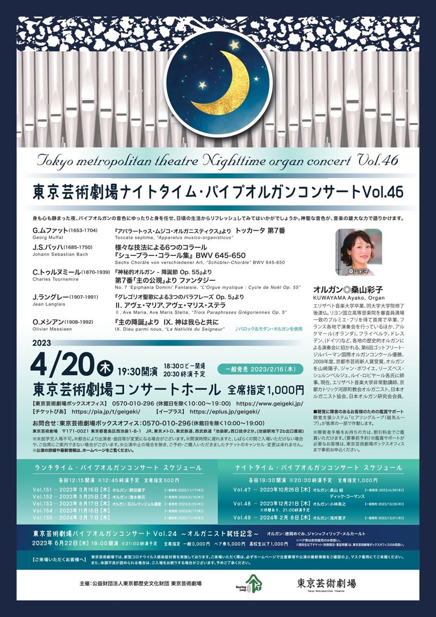 東京芸術劇場ナイトタイム・パイプオルガンコンサート Vol.46 23/4/20(木) 東京芸術劇場 コンサートホール シェア ツイート 夜の静まった時に聴く、パイプオルガンの神聖で雄大な音色 公演情報 ジャンル ピアノ・鍵盤楽器 未就学児童は入場不可。出演者・曲目は都合により変更の可能性あり。公演中止以外のいかなる場合でも、チケットのキャンセルはいたしかねます。 料金 全席指定-1,000円 表示できるチケット情報はありません詳しくはこちら キャスト&スタッフ 出演 桑山彩子 お問い合わせ 東京芸術劇場ボックスオフィス 公式サイト シェア ツイート