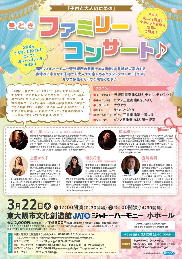 「子供と大人のための」昼どきファミリーコンサート♪ 23/3/22(水) 東大阪市文化創造館 ジャトーハーモニー 小ホール シェア ツイート 公演情報 ジャンル 器楽 室内楽 ※3歳以下は無料。※都合により、演奏曲目、演奏曲順が変更になる場合があります。予めご了承ください。 料金 全席指定 大人(高校生以上)-2,000円 全席指定 子供(4歳~中学生)-500円 表示できるチケット情報はありません詳しくはこちら キャスト&スタッフ 出演 向井航 松本和将 上里はな子 増永花恵 豊嶋泰嗣 お問い合わせ キョードーインフォメーション 公式サイト シェア ツイート