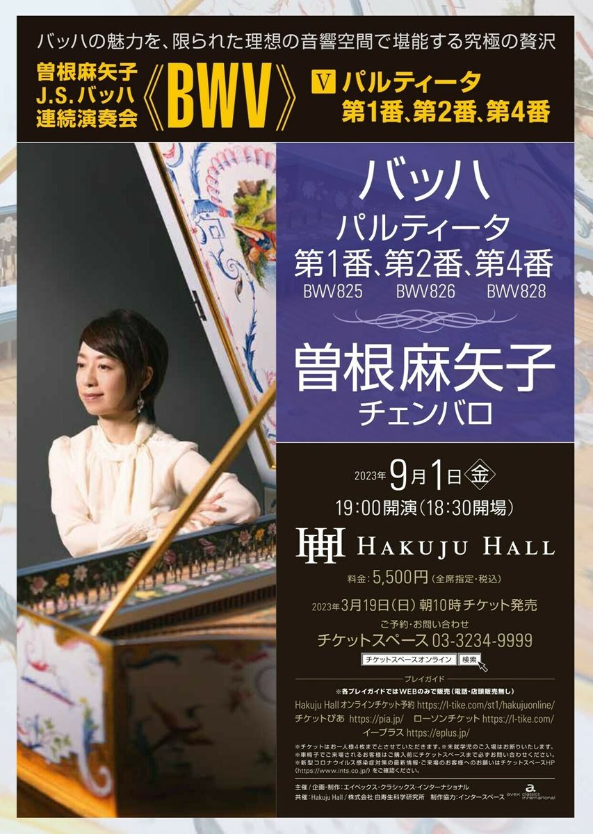 曽根麻矢子 バッハ 連続演奏会 23/9/1(金) Hakuju Hall シェア ツイート バッハの魅力を限られた理想の音響空間で堪能する究極の贅沢 バッハ:パルティータ第1番、第2番、第4番 公演情報 ジャンル ピアノ・鍵盤楽器 未就学児童は入場不可。車椅子でご来場されるお客様はご購入前にチケットスペースまで必ずお問い合わせください。新型コロナウイルス感染症対策の最新情報・ご来場のお客様へのお願いはチケットスペースHP(https://www.ints.co.jp/)をご確認ください。 料金 全席指定-5,500円 表示できるチケット情報はありません詳しくはこちら キャスト&スタッフ チェンバロ 曽根麻矢子 お問い合わせ チケットスペース シェア ツイート