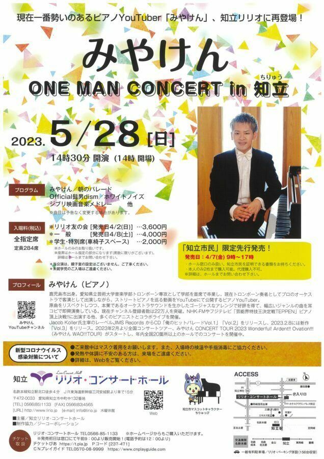 みやけん ONE MAN CONCERT in 知立 23/5/28(日) 知立リリオ・コンサートホール シェア ツイート 公演情報 ジャンル ピアノ・鍵盤楽器 車椅子スペース券あり。但し、ぴあでの取扱いなし。詳細は問合せ先まで。未就学児童は入場不可。ご来場の際は、マスクの着用等にご協力お願いいたします。公演当日に発熱等の風邪症状が認められたお客様のご入場をお断りする場合がございます。 料金 全指定席-4,000円 表示できるチケット情報はありません詳しくはこちら キャスト&スタッフ ピアノ みやけん お問い合わせ リリオ・コンサートホール 公式サイト シェア ツイート
