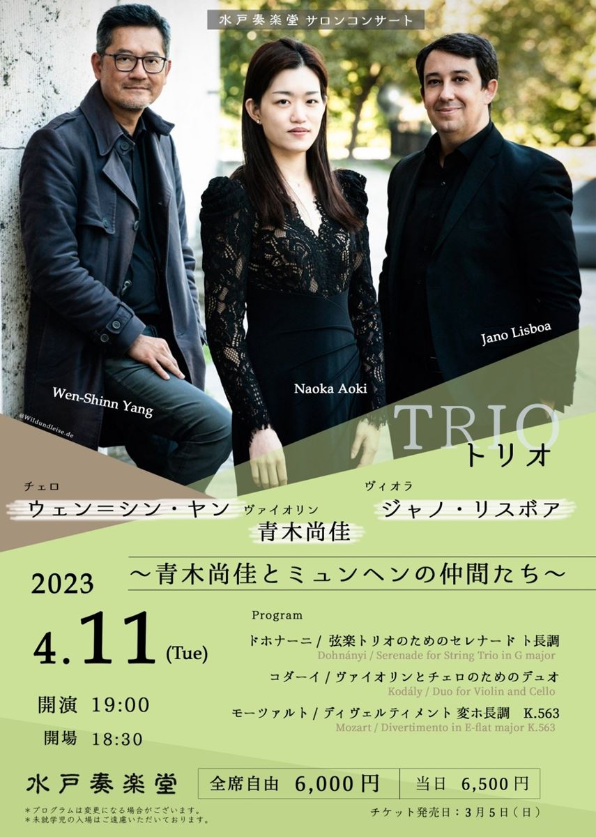 青木尚佳&ジャノ・リスボア&ウェン=シン・ヤンTrio 23/4/11(火) 水戸奏楽堂 シェア ツイート 青木尚佳とミュンヘンの仲間たち 公演情報 ジャンル 器楽 室内楽 未就学児童は入場不可。 料金 全席自由-6,000円 表示できるチケット情報はありません詳しくはこちら キャスト&スタッフ 出演 青木尚佳 ジャノ・リスボア ウェン=シン・ヤン お問い合わせ 水戸奏楽堂 公式サイト シェア ツイート