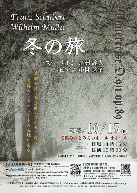 【公演中止】歌曲集「冬の旅」D911 糸洲義人・中村悠子リサイタル 23/10/15(日) 横浜みなとみらいホール 小ホール シェア ツイート すべての写真(4)を見る 歌曲集最高峰のシューベルト「冬の旅」を深い研究と解釈で糸洲義人・中村悠子デュオがお届けします。 すべての写真(4)を見る 公演情報 ジャンル 声楽 未就学児のご入場についてはお問合せください。 料金 全席自由 大人-3,000円 全席自由高校生以下-1,500円 表示できるチケット情報はありません詳しくはこちら キャスト&スタッフ 出演 糸洲義人 中村悠子 お問い合わせ Lied研究会 糸洲義人 シェア ツイート