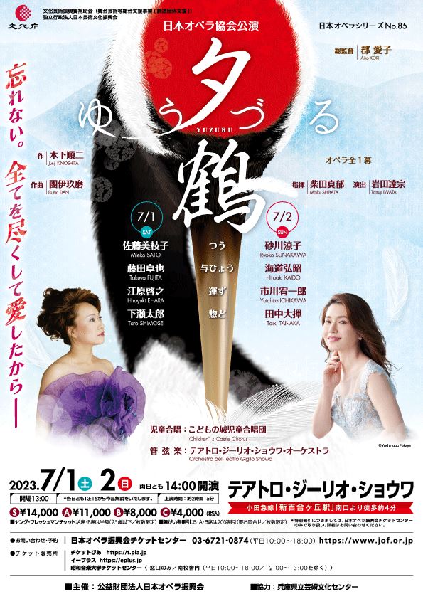 日本オペラ協会公演 日本オペラシリーズNo.85「夕鶴」 23/7/1(土)~23/7/2(日) 昭和音楽大学 テアトロ・ジーリオ・ショウワ シェア ツイート 公演情報 ジャンル オペラ 声楽 料金 S席-14,000円 A席-11,000円 B席-8,000円 C席-4,000円 表示できるチケット情報はありません詳しくはこちら キャスト&スタッフ 指揮 柴田真郁 演出 岩田達宗 出演 佐藤美枝子 藤田卓也 江原啓之 下瀬太郎 砂川涼子 海道弘昭 市川宥一郎 田中大揮 合唱 こどもの城児童合唱団 演奏 テアトロ・ジーリオ・ショウワ・オーケストラ お問い合わせ 日本オペラ振興会チケットセンター 公式サイト シェア ツイート