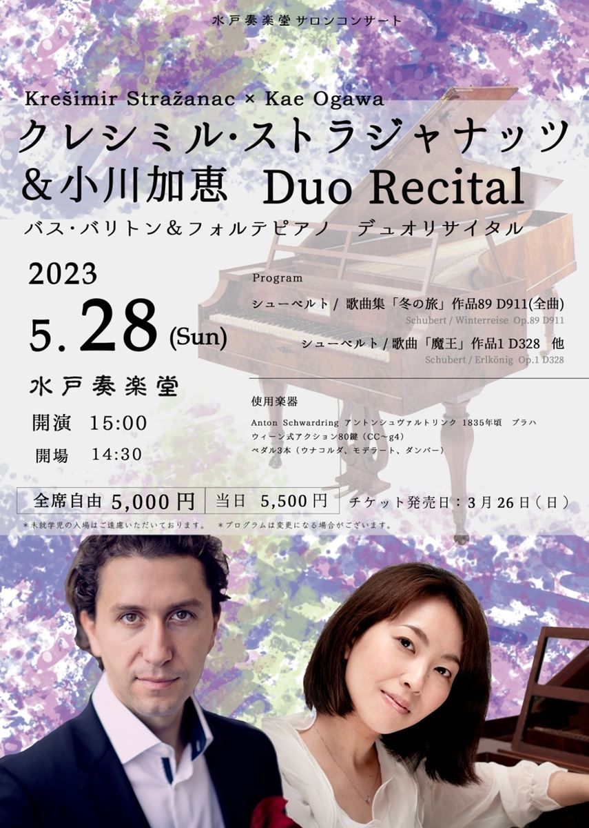 クレシミル・ストラジャナッツ&小川加恵 デュオリサイタル 23/5/28(日) 水戸奏楽堂 シェア ツイート シューベルト:歌曲集「冬の旅」作品89 D911(全曲)/シューベルト:歌曲「魔王」作品1 D328 他 公演情報 ジャンル 器楽 室内楽 未就学児童は入場不可 料金 全席自由-5,000円 表示できるチケット情報はありません詳しくはこちら キャスト&スタッフ 出演 クレシミル・ストラジャナッツ 小川加恵 お問い合わせ 水戸奏楽堂 公式サイト シェア ツイート