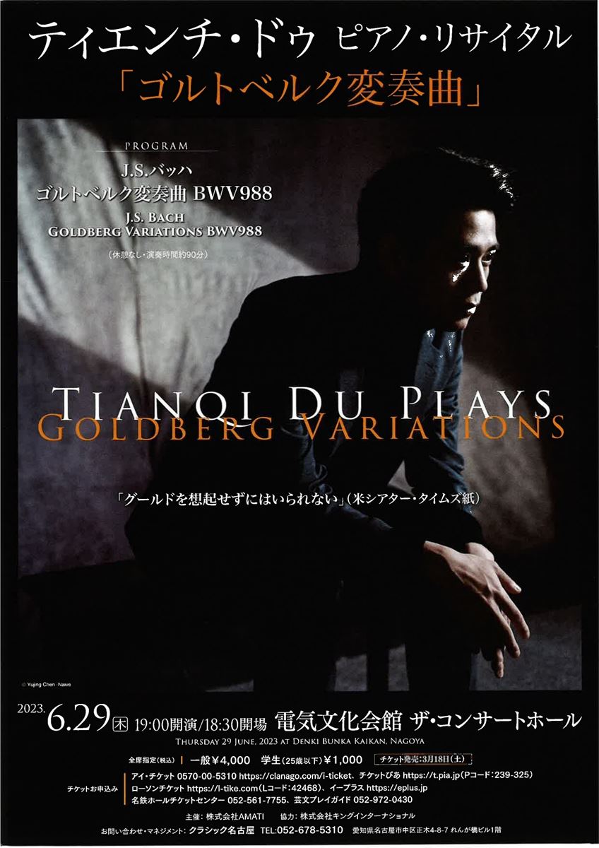 ティエンチ・ドゥ ピアノリサイタル「ゴルトベルク変奏曲」 23/6/29(木) 電気文化会館 ザ・コンサートホール シェア ツイート すべての写真(2)を見る すべての写真(2)を見る 公演情報 ジャンル ピアノ・鍵盤楽器 学生券は入場時要証明書提示。やむを得ない事情により、曲目が変更となる場合がございます。公演中止を除き、お買い求めいただきましたチケットのキャンセル・変更等はできません。未就学児の同伴はご遠慮ください。また就学児以上のお子様もご入場には1人1枚のチケットが必要です。 料金 一般-4,000円 学生-1,000円 学生-25歳以下の学生 表示できるチケット情報はありません詳しくはこちら キャスト&スタッフ ピアノ ティエンチ・ドゥ お問い合わせ クラシック名古屋 シェア ツイート