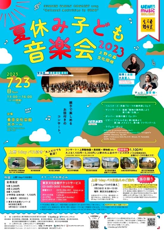 夏休み子ども音楽会2023《上野の森文化探検》 23/7/23(日) 東京文化会館 大ホール シェア ツイート 親子で楽しめるお話付きのコンサート。 公演情報 ジャンル オーケストラ 未就学児童は入場不可。小中学生は要身分証明書。チケットは上野1dayパス付。 料金 S席一般-3,300円 S席小中学生-1,100円 A席一般-2,200円 A席小中学生-1,100円 B席一般-1,100円 B席小中学生-1,100円 表示できるチケット情報はありません詳しくはこちら キャスト&スタッフ 指揮 大友直人 チェロ 笹沼樹 管弦楽 東京都交響楽団 お問い合わせ 東京文化会館チケットサービス 公式サイト シェア ツイート