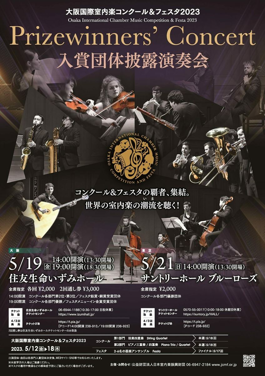 大阪国際室内楽コンクール&フェスタ2023 披露演奏会(夜公演) 23/5/19(金) 住友生命いずみホール シェア ツイート 大阪国際室内楽コンクール&フェスタ2023入賞団体による世界レベルの熱演 公演情報 ジャンル 器楽 室内楽 未就学児童は入場不可。入場に際して感染症予防にご協力いただく場合があります。 料金 全席指定-2,000円 表示できるチケット情報はありません詳しくはこちら キャスト&スタッフ 出演 コンクール第1部門(弦楽四重奏)1位受賞団体 コンクール第2部門(ピアノ三重奏、四重奏)1位受賞団体 フェスタ メニューイン金賞 受賞団体 お問い合わせ 日本室内楽振興財団 シェア ツイート