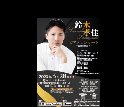 鈴木孝佳ピアノコンサート 23/5/28(日) 野木エニスホール(野木町文化会館)小ホール シェア ツイート ピアニスト鈴木孝佳が送る渾身の音楽をお届けします 公演情報 ジャンル ピアノ・鍵盤楽器 未就学児は入場不可、子供料金は中学生まで。親子ペアチケットは1枚で大人と中学生までの子供を含む2名まで入場可能。中学生以下10名様までご招待(主催へお問い合わせください) 料金 自由席 大人-1,500円 自由席 子供-500円 親子ペア-1,700円 表示できるチケット情報はありません詳しくはこちら キャスト&スタッフ 出演 鈴木孝佳 お問い合わせ 音鈴Piano Academy シェア ツイート