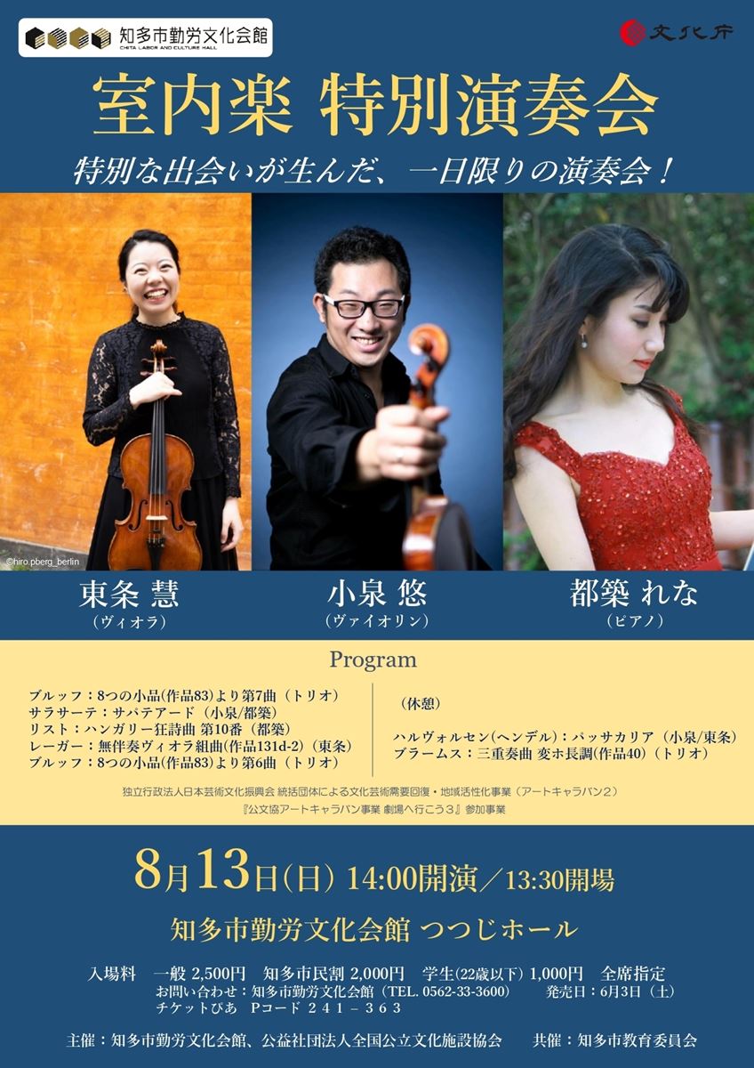室内楽特別演奏会 23/8/13(日) 知多市勤労文化会館 つつじホール シェア ツイート ベルリンフィルやパリ管弦楽団、マルボロ音楽祭などで活躍するヴィオラ奏者・東条 慧を、名古屋フィルのヴァイオリニスト・小泉 悠、ピアニストの都築れなという、息の合った地元の名手ふたりが知多へ迎えて贈る、まさに「特別」なコンサート! 公演情報 ジャンル 室内楽 ※未就学児入場不可 料金 一般-2,500円 学生(22歳以下)-1,000円 学生(22歳以下)-入場時学生証提示要 表示できるチケット情報はありません詳しくはこちら キャスト&スタッフ 出演 小泉悠 東条慧 都築れな お問い合わせ 知多市勤労文化会館 シェア ツイート