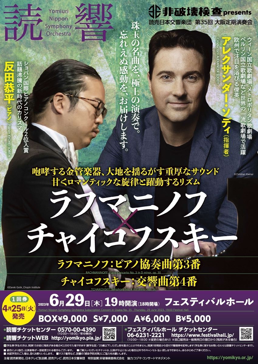 読響大阪定期演奏会 23/6/29(木) フェスティバルホール シェア ツイート ラフマニノフ:ピアノ協奏曲第3番 ニ短調 作品30〈生誕150年記念〉/チャイコフスキー:交響曲第4番 ヘ短調 作品36 公演情報 ジャンル オーケストラ 未就学児童は入場不可。連続券・車椅子席・学生席は問合せ先まで。 料金 BOX席-9,000円 S席-7,000円 A席-6,000円 B席-5,000円 表示できるチケット情報はありません詳しくはこちら キャスト&スタッフ 指揮 アレクサンダー・ソディー 管弦楽 読売日本交響楽団 ピアノ 反田恭平 お問い合わせ 読響チケットセンター 公式サイト シェア ツイート