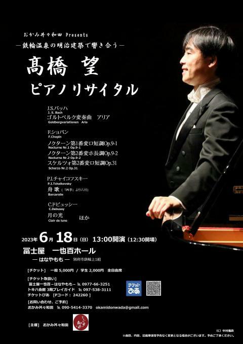 高橋望ピアノリサイタル ~鉄輪温泉の明治建築と響きあう~ 23/6/18(日) 冨士屋 一也百ホール シェア ツイート すべての写真(2)を見る 鉄輪温泉の風情を残す明治の建物で聴く高橋望のピアノリサイタル すべての写真(2)を見る 公演情報 ジャンル 器楽 室内楽 小学生以上対象。学生チケットは大学生以下、当日学生証を提示。 料金 全席自由 一般-5,000円 全席自由 学生-2,000円 表示できるチケット情報はありません詳しくはこちら キャスト&スタッフ 出演 高橋望 [出演]高橋望 お問い合わせ おかみ丼々和田 シェア ツイート