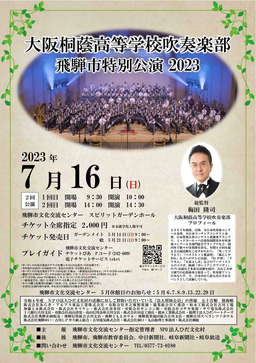 大阪桐蔭高等学校吹奏楽部 飛騨市特別公演2023 23/7/16(日) 飛騨市文化交流センター シェア ツイート 公演情報 ジャンル 吹奏楽 車いす席あり。但し、ぴあでの取扱いなし。詳細は問合せ先まで。未就学児童は入場不可。 料金 1回目 一般-2,000円 2回目 一般-2,000円 表示できるチケット情報はありません詳しくはこちら キャスト&スタッフ 出演 大阪桐蔭高等学校吹奏楽部 お問い合わせ 飛騨市文化交流センター 公式サイト シェア ツイート