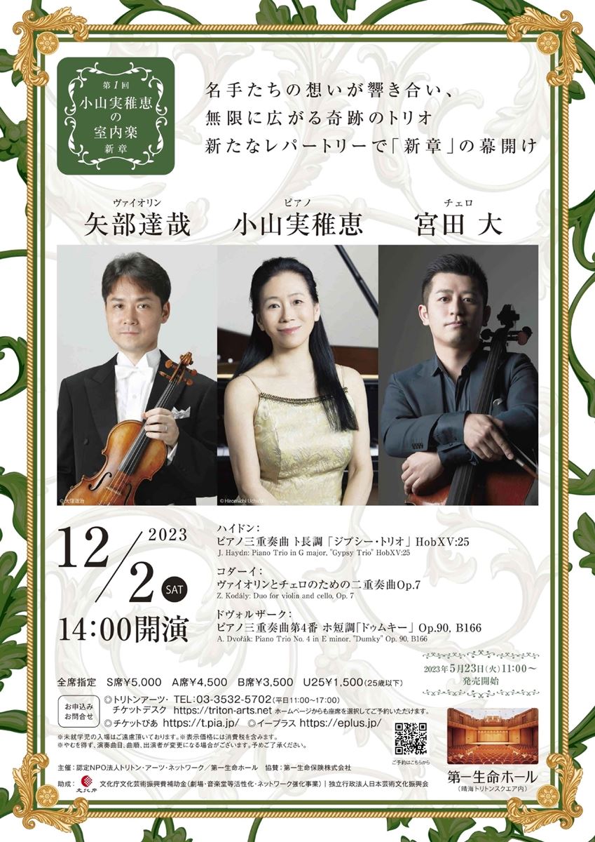 小山実稚恵の室内楽・新章 第1回 小山実稚恵&矢部達哉&宮田大 23/12/2(土) 第一生命ホール シェア ツイート すべての写真(2)を見る 名手たちの想いが響き合い、無限に広がる奇跡のトリオ。新たなレパートリーで「新章」の幕開け すべての写真(2)を見る 公演情報 ジャンル 器楽 室内楽 ピアノ・鍵盤楽器 未就学児童は入場不可。 料金 一般S席-5,000円 U25 S席-1,500円 一般A席-4,500円 U25 A席-1,500円 一般B席-3,500円 U25 B席-1,500円 表示できるチケット情報はありません詳しくはこちら キャスト&スタッフ 出演 小山実稚恵 矢部達哉 宮田大 お問い合わせ トリトンアーツ・チケットデスク 公式サイト シェア ツイート