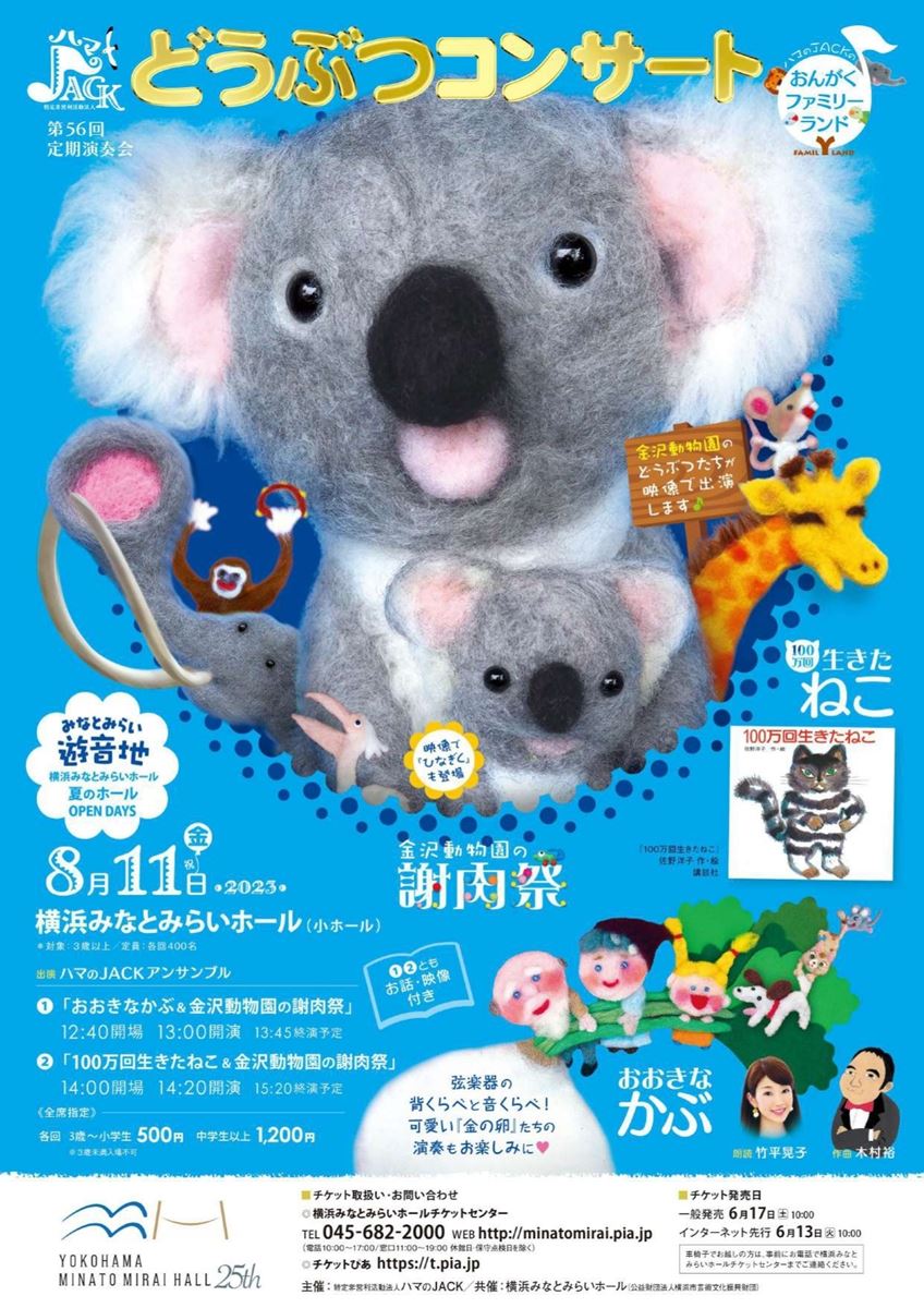 ハマのJACKのおんがくファミリーランド どうぶつコンサート ~金沢動物園の謝肉祭 23/8/11(金) 横浜みなとみらいホール 小ホール シェア ツイート 金沢動物園にいる可愛い動物たちが映像で登場! 公演情報 ジャンル 器楽 室内楽 3歳未満は入場不可。 料金 全席指定 中学生以上-1,200円 全席指定 3歳~小学生-500円 表示できるチケット情報はありません詳しくはこちら キャスト&スタッフ 出演 白井篤 三又治彦 村松龍 海野幹雄 松井理史 お問い合わせ 横浜みなとみらいホールチケットセンター 公式サイト シェア ツイート