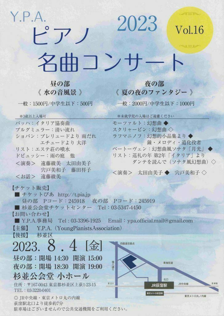 YPAピアノ名曲コンサートVol.16昼の部「水の音風景」 23/8/4(金) 杉並公会堂 小ホール シェア ツイート 暑い夏の日、水に関係ある作品の数々で涼やかなひと時をお過ごしください。 公演情報 ジャンル ピアノ・鍵盤楽器 3歳以上入場可。施設内での会話の抑制、咳エチケットにご協力をお願いいたします。 料金 全席自由 一般-1,500円 全席自由中学生以下-500円 表示できるチケット情報はありません詳しくはこちら キャスト&スタッフ 出演 遠藤綾美 太田由美子 藤田祥子 お問い合わせ YPA(ワイピーエイ)事務局 シェア ツイート