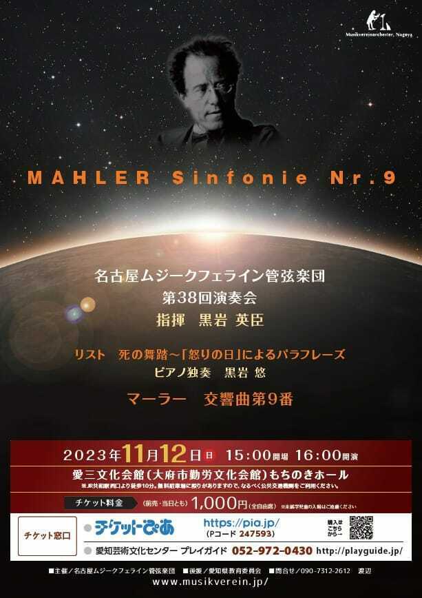 名古屋ムジークフェライン管弦楽団第38回演奏会 23/11/12(日) 愛三文化会館 もちのきホール シェア ツイート マーラー:交響曲第九番/リスト:死の舞踏〜「怒りの日」によるパラフレーズ 公演情報 ジャンル オーケストラ 未就学児は入場不可。 料金 全席自由-1,000円 表示できるチケット情報はありません詳しくはこちら キャスト&スタッフ 出演 黒岩英臣 黒岩悠 お問い合わせ 楽団事務局 渡辺 公式サイト シェア ツイート