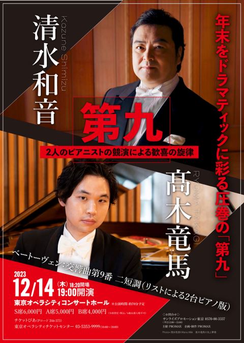 清水和音×髙木竜馬 第九 23/12/14(木) 東京オペラシティ コンサートホール:タケミツメモリアル シェア ツイート 〜2人のピアニストの競演による歓喜の旋律〜 ベートーヴェン:交響曲第9番 ニ短調 リストによる2台ピアノ版 公演情報 ジャンル ピアノ・鍵盤楽器 6歳未満入場不可。 料金 S席-6,000円 A席-5,000円 B席-4,000円 表示できるチケット情報はありません詳しくはこちら キャスト&スタッフ ピアノ 清水和音 高木竜馬 お問い合わせ サンライズプロモーション東京 公式サイト シェア ツイート