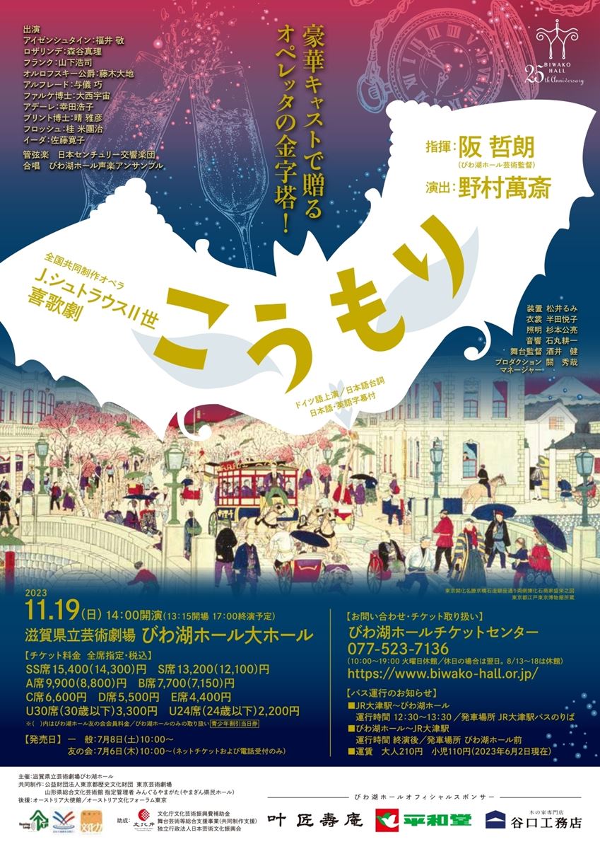 J.シュトラウスII世 作曲 喜歌劇 「こうもり」 23/11/19(日) 滋賀県立芸術劇場 びわ湖ホール 大ホール シェア ツイート すべての写真(2)を見る 狂⾔師野村萬斎がオペラ初演出! 阪哲朗が⼗⼋番のオペレッタ最⾼傑作『こうもり』を上演。 すべての写真(2)を見る 公演情報 ジャンル オペラ 声楽 全3幕。ドイツ語上演/日本語台詞、日本語・英語字幕付き。6歳以上入場可。S席、A席、B席のみ販売。 料金 S席-13,200円 A席-9,900円 B席-7,700円 表示できるチケット情報はありません詳しくはこちら キャスト&スタッフ 指揮 阪哲朗 演出 野村萬斎 出演 福井敬 森谷真理 山下浩司 藤木大地 与儀巧 大西宇宙 幸田浩子 晴雅彦 桂米團治 佐藤寛子 演奏 日本センチュリー交響楽団 合唱 びわ湖ホール声楽アンサンブル お問い合わせ びわ湖ホール 公式サイト シェア ツイート