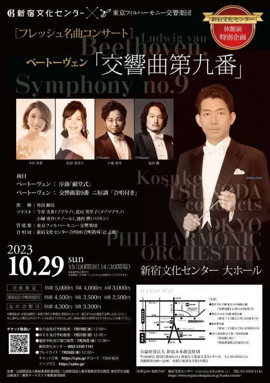 フレッシュ名曲コンサート ベートーヴェン「交響曲第九番」 23/10/29(日) 新宿文化センター 大ホール シェア ツイート ベートーヴェン:『献堂式』序曲、交響曲第9番 ニ短調 Op.125「合唱付」 公演情報 ジャンル オーケストラ 未就学児童は入場不可。 料金 SS席-5,000円 S席-4,000円 A席-3,000円 表示できるチケット情報はありません詳しくはこちら キャスト&スタッフ 指揮 角田鋼亮 ソプラノ 今井実希 メゾソプラノ 花房英里子 テノール 小堀勇介 バリトン 池内響 管弦楽 東京フィルハーモニー交響楽団 合唱 新宿文化センター合唱団 お問い合わせ 新宿未来創造財団 公式サイト シェア ツイート
