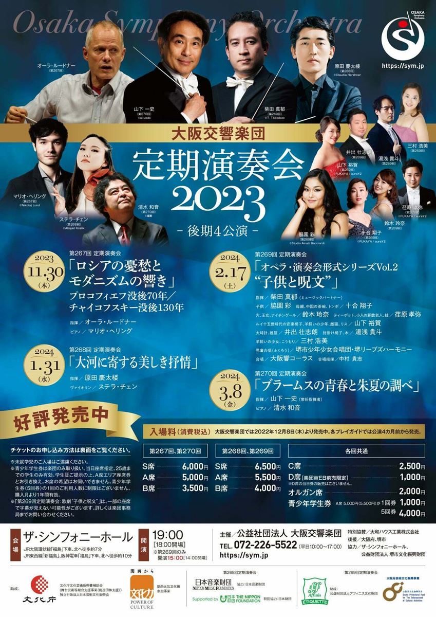大阪交響楽団 第267回定期演奏会 23/11/30(木) ザ・シンフォニーホール シェア ツイート 「ロシアの憂愁とモダニズムの響き 」 プロコフィエフ:ピアノ協奏曲 第3番 ハ長調 作品26/チャイコフスキー:交響曲 第6番 ロ短調 作品74「悲愴」 公演情報 ジャンル オーケストラ D席、青少年学生券は取り扱いなし。未就学児童は入場不可。 料金 S席-6,000円 A席-5,000円 B席-3,500円 C席-2,500円 オルガン席-2,000円 表示できるチケット情報はありません詳しくはこちら キャスト&スタッフ 指揮 オーラ・ルードナー ピアノ マリオ・ヘリング 管弦楽 大阪交響楽団 お問い合わせ 大阪交響楽団 公式サイト シェア ツイート