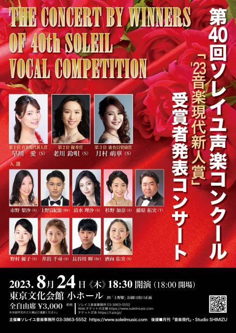 第40回ソレイユ声楽コンクール受賞者発表コンサート 23/8/24(木) 東京文化会館 小ホール シェア ツイート 公演情報 ジャンル オペラ 声楽 未就学児童は入場不可。 料金 全自由-3,000円 表示できるチケット情報はありません詳しくはこちら キャスト&スタッフ 出演 酒向佑実 長谷川暉 井出千尋 野村優子 藤原拓実 杉野加奈 清水理沙 上野富紀翁 市野梨沙 月村萌華 老川鈴唄 早川愛 [出演]酒向佑実 / 長谷川暉 / 井出千尋 / 野村優子 / 藤原拓実 / 杉野加奈 / 清水理沙 / 上野富紀翁 / 市野梨沙 / 月村萌華 / 老川鈴唄 / 早川愛 お問い合わせ ソレイユ音楽事務所 シェア ツイート