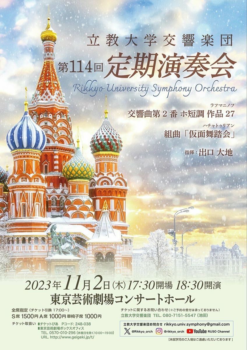 立教大学交響楽団 第114回 定期演奏会 23/11/2(木) 東京芸術劇場 コンサートホール シェア ツイート 公演情報 ジャンル オーケストラ 未就学児童は入場不可。 料金 S席-1,500円 A席-1,000円 表示できるチケット情報はありません詳しくはこちら キャスト&スタッフ 管弦楽 立教大学交響楽団 指揮 山口大地 お問い合わせ 池田 シェア ツイート