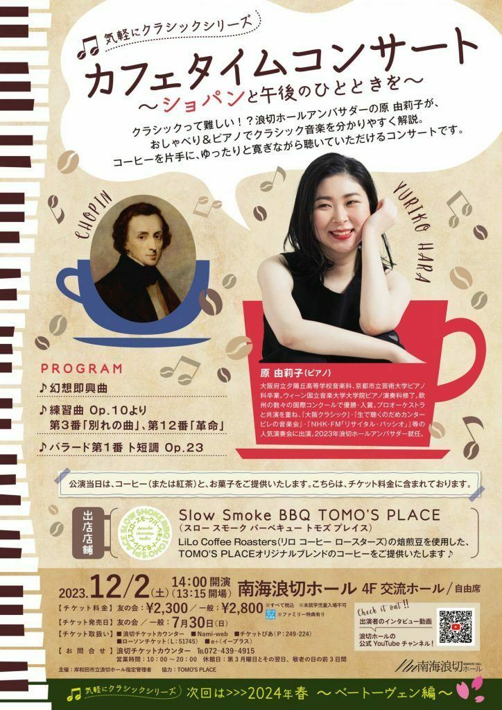 気軽にクラシックシリーズ カフェタイムコンサート 23/12/2(土) 南海浪切ホール 4F 交流ホール シェア ツイート クラシックって難しい!?浪切ホールアンバサダーの原 由莉子が、おしゃべり&ピアノでクラシック音楽を分かりやすく解説。コーヒーを片手に、ゆったりと寛ぎながら聴いていただけるコンサートです。 公演情報 ジャンル ピアノ・鍵盤楽器 未就学児童は入場不可。 料金 自由席-2,800円 自由席-コーヒーor紅茶+お菓子付 表示できるチケット情報はありません詳しくはこちら キャスト&スタッフ 出演 原由莉子 お問い合わせ 浪切チケットカウンター 公式サイト シェア ツイート