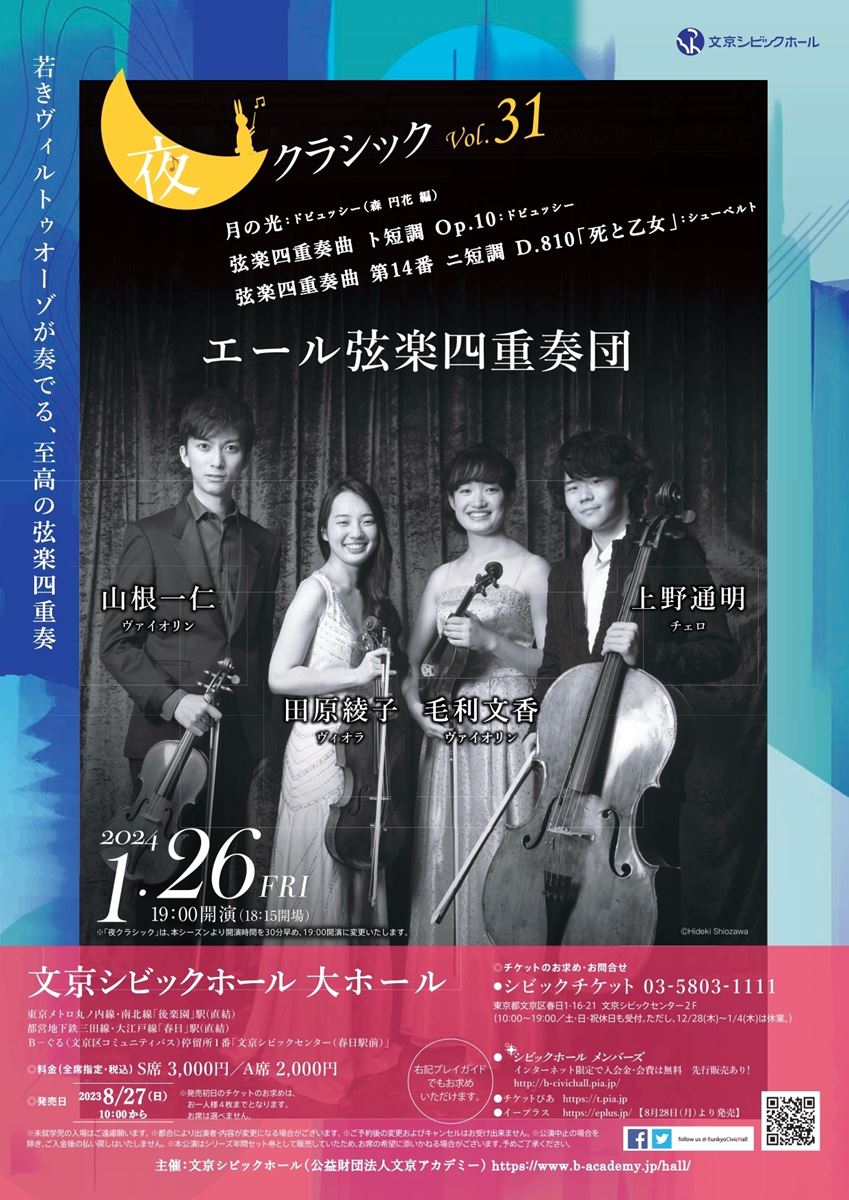 夜クラシックVol.31 エール弦楽四重奏団 24/1/26(金) 文京シビックホール 大ホール シェア ツイート すべての写真(2)を見る ~若きヴィルトゥオーゾが奏でる、至高の弦楽四重奏~ すべての写真(2)を見る 公演情報 ジャンル 器楽 室内楽 未就学児童は入場不可。 料金 S席-3,000円 A席-2,000円 表示できるチケット情報はありません詳しくはこちら キャスト&スタッフ 出演 エール弦楽四重奏団 お問い合わせ シビックチケット 公式サイト シェア ツイート