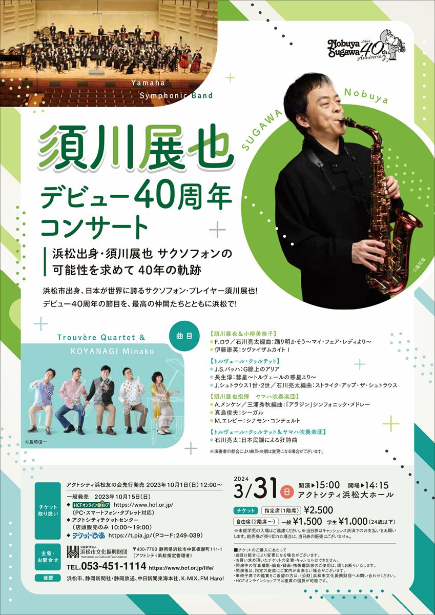 須川展也 デビュー40周年コンサート 24/3/31(日) アクトシティ浜松 大ホール シェア ツイート 浜松出身・須川展也 サクソフォンの可能性を求めて 40年の軌跡 公演情報 ジャンル 器楽 室内楽 未就学児童は入場不可。 料金 指定席(1階)-2,500円 自由席(一般)-1,500円 自由席(学生)-1,000円 自由席(学生)-24歳以下 表示できるチケット情報はありません詳しくはこちら キャスト&スタッフ 出演 須川展也 共演 トルヴェール・クヮルテット 小柳美奈子 ヤマハ吹奏楽団 お問い合わせ 浜松市文化振興財団 公式サイト シェア ツイート