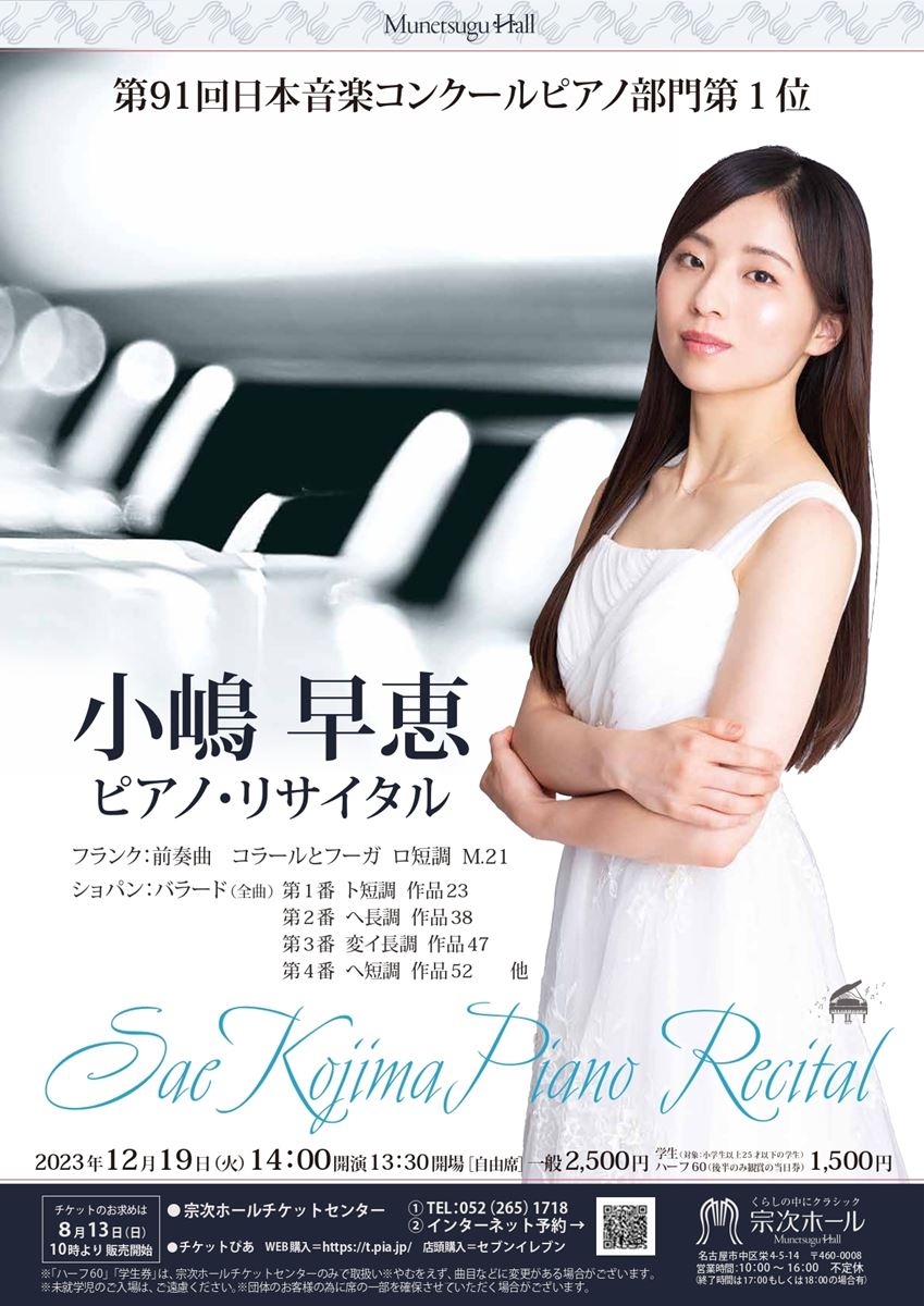 学生券・セット券は、宗次ホールチケットセンターでのみ販売いたします。未就学児童は入場不可。公演開催についての最新情報は宗次ホールホームページまたは問合せ先までご確認ください。感染対策/座席定員/中止・振替等についてhttps://munetsuguhall.com/news/ 入場整理番号についてhttps://munetsuguhall.com/news/general/entry-2478.html ご確認の上、ご来場いただきますようお願い致します。営利目的の転売は禁止します。